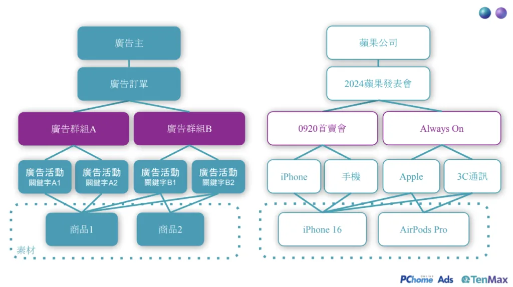 在開始建立廣告活動前,請務必先理解系統的階層關係:廣告主 > 廣告訂單 > 廣告群組 > 廣告活動: