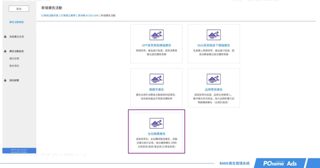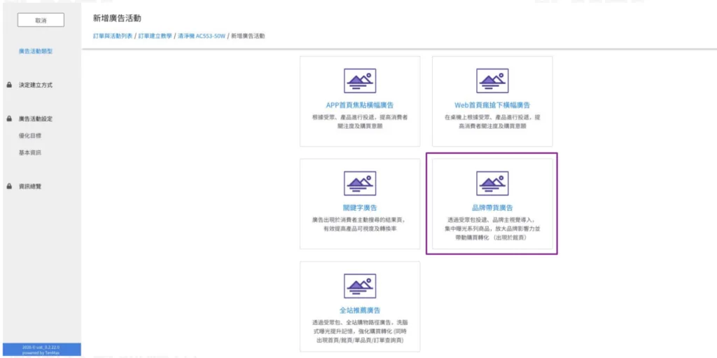 選擇要設定的素材種類(品牌帶貨、全站推薦)