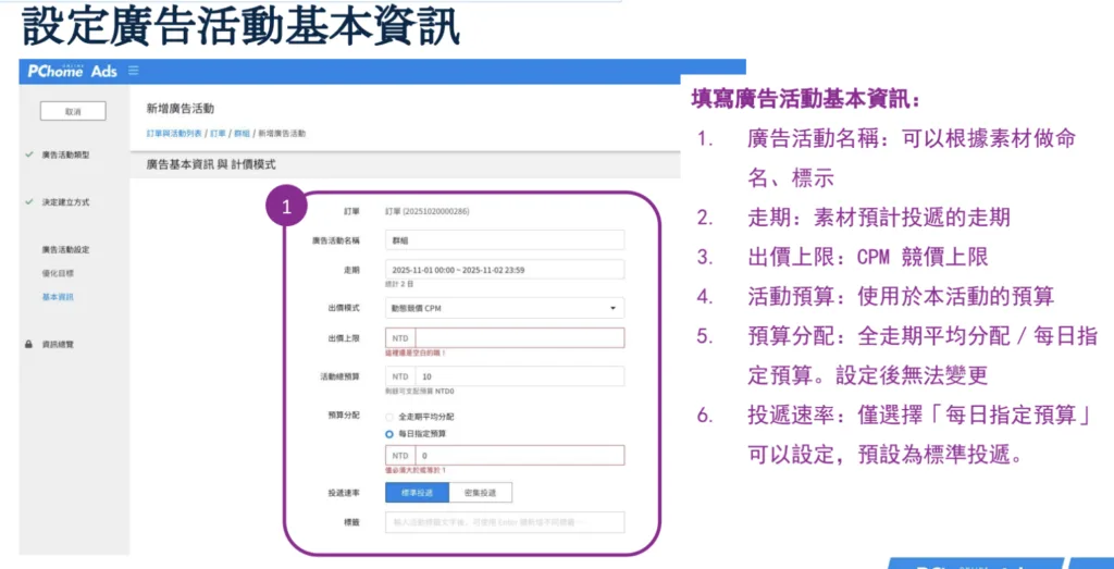 - 設定 CPM 出價(全站推薦 20 元起、品牌帶貨 80 元起) 。