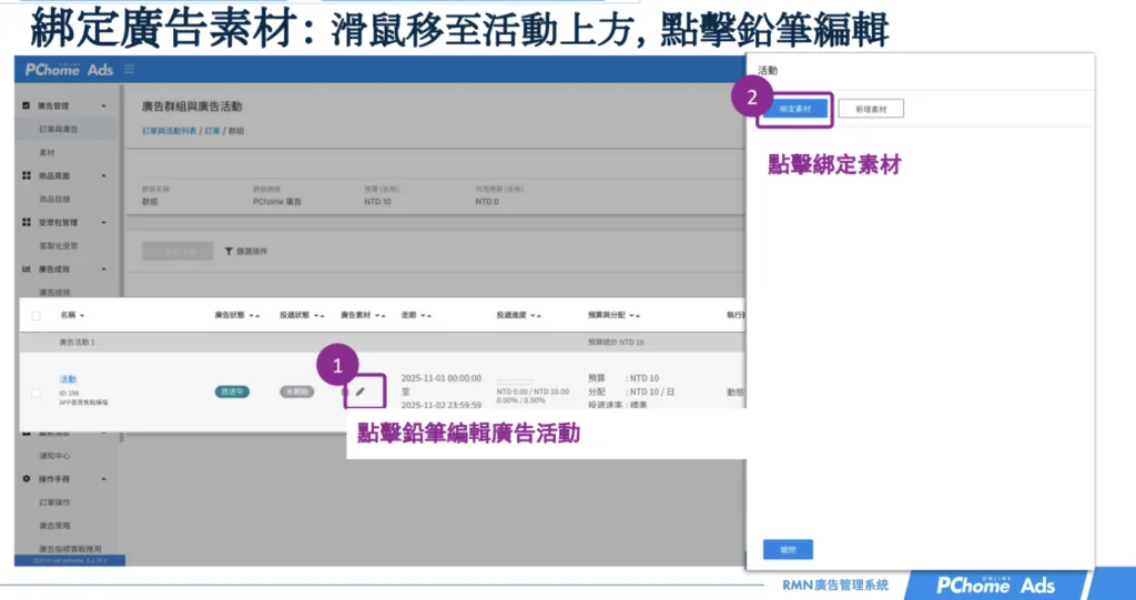 完成綁定: 廣告活動建立後,點擊「鉛筆」編輯,將 Step 2 設定好的素材「啟用」綁定 。