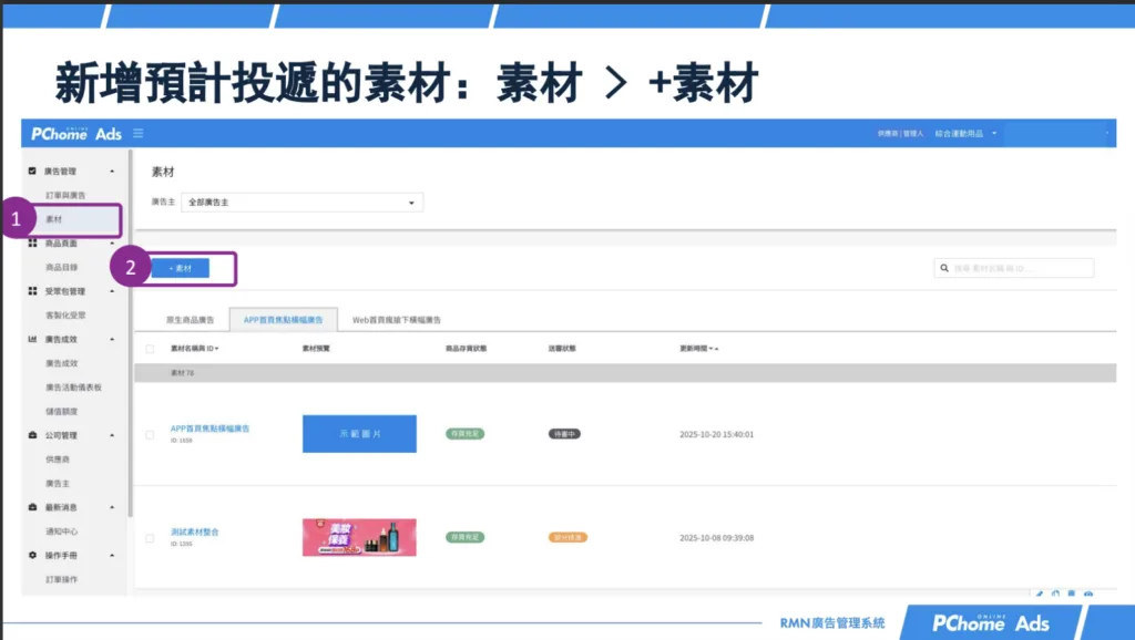 - 很多人建立完廣告活動就以為結束了,請務必確認素材狀態顯示為「放送中」,且商品存貨充足 。
