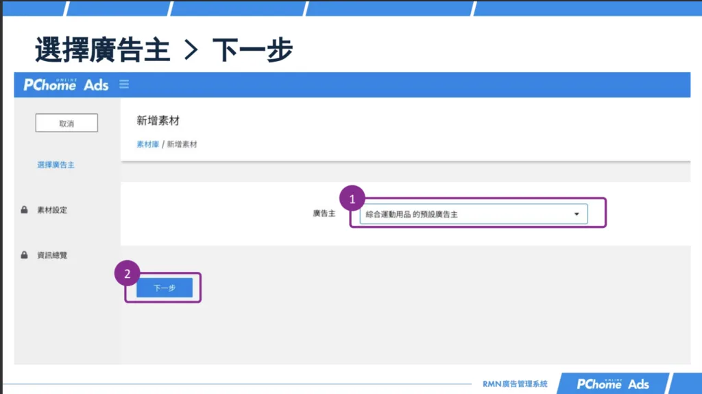 選擇預計投遞廣告的廣告主,並點擊下一步
