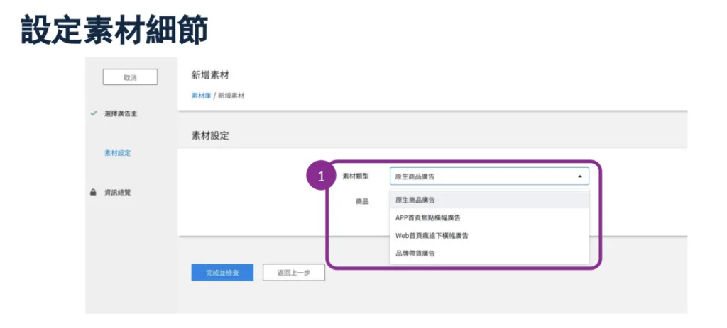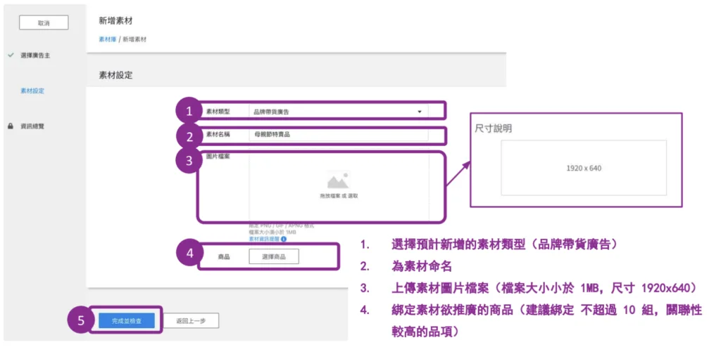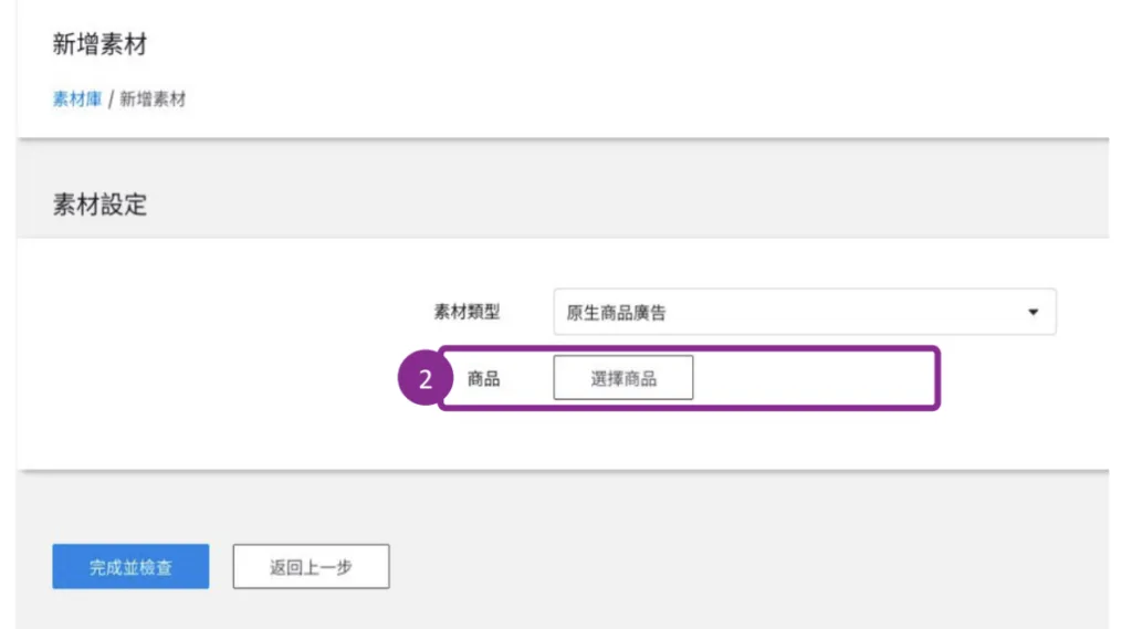 - 路徑: 素材 > +素材 > 選擇類型 > 綁定欲推廣的商品(建議 10 組以內) 。