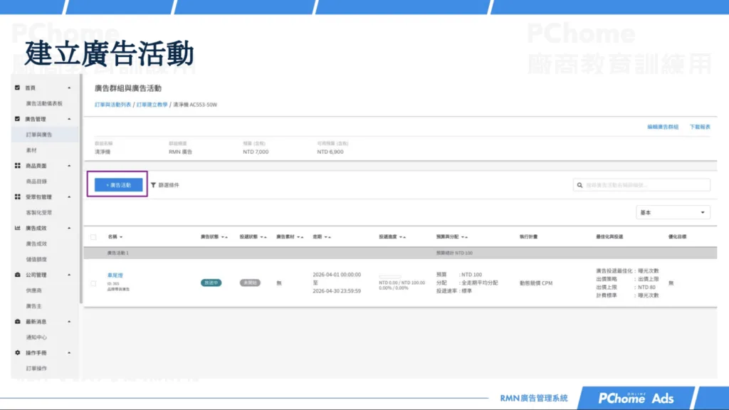 路徑: 訂單與廣告 > 進入對應群組 > +廣告活動 。