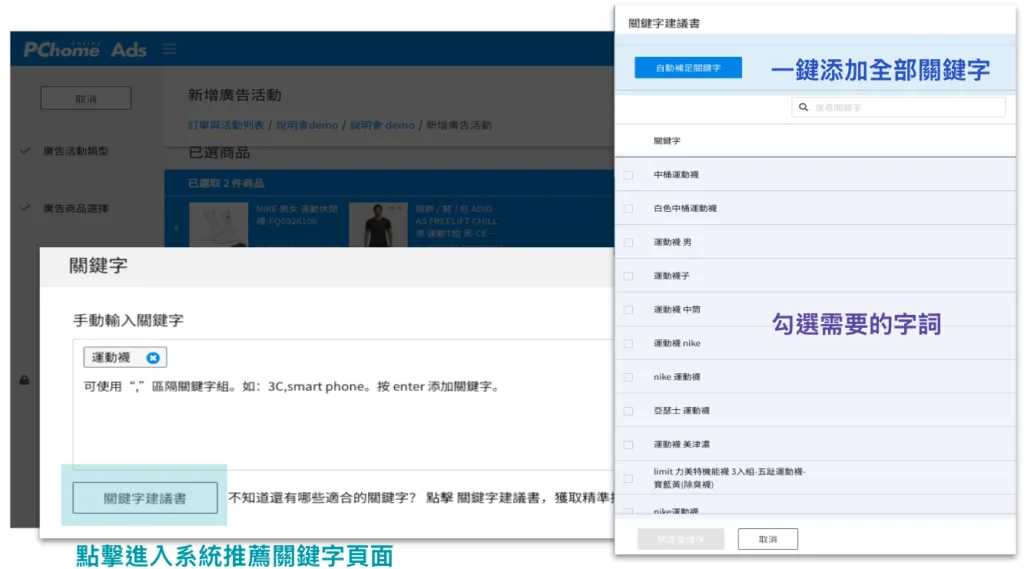 可以選擇點擊上方的「自動補足關鍵字」,或者一個一個勾選需要的關鍵字詞